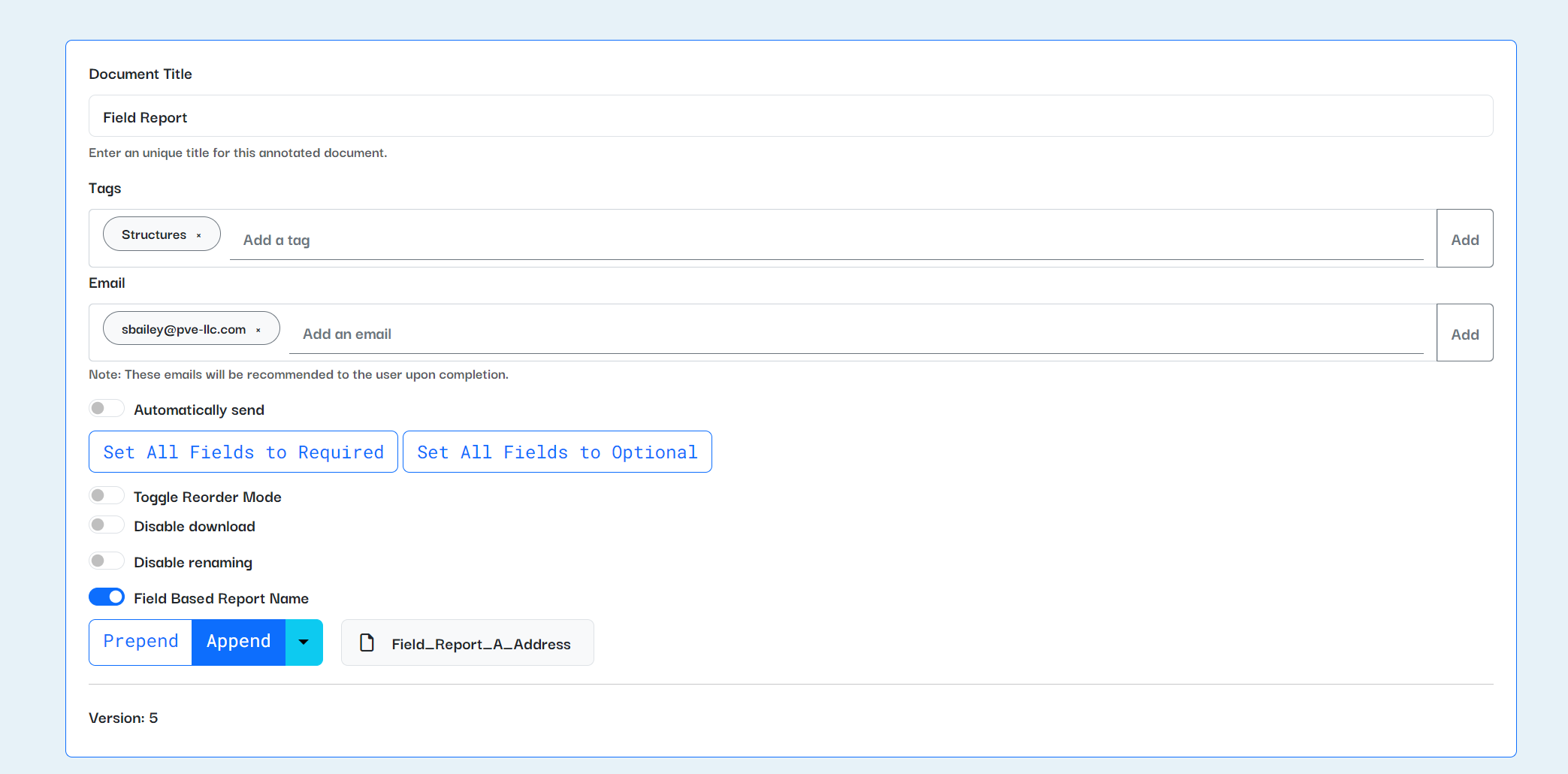 Reports can be named based on their fields. This will allow you to change the default filename for completed reports โ want your documents to be named โ123 Main Street Field Reportโ instead of just โField Reportโ? Now you can.