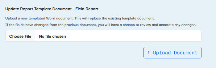To update, click the gear icon next to one of your reports, then click the "Word document" icon. From there, you can upload a new version of your template and, if the fields have changed, you'll have the opportunity to add that information to your report.
