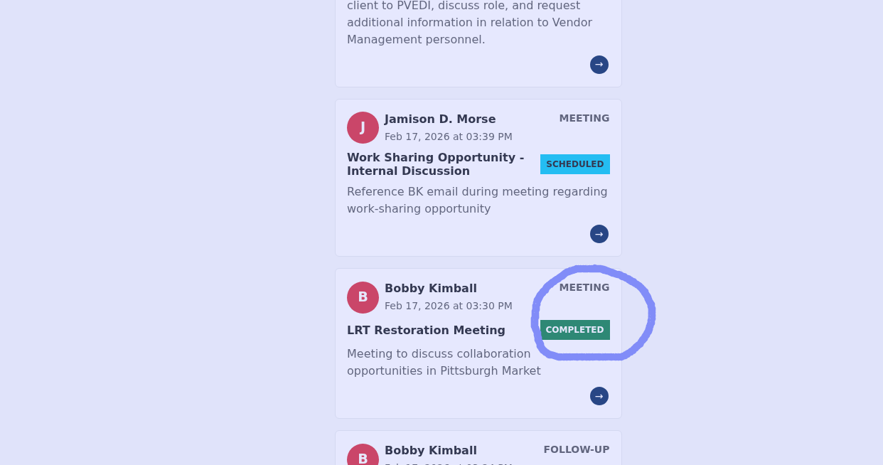 Can we make it easier to change the status of an activity? For example, from scheduled to completed without having to open and edit the activity? Similarly, if a new activity is completed could it be archived and prompt a new activity? For example, if I complete a business development meeting when i change the status from “scheduled” to “Complete” it would be nice to be prompted with a new activity such as follow-up, etc.